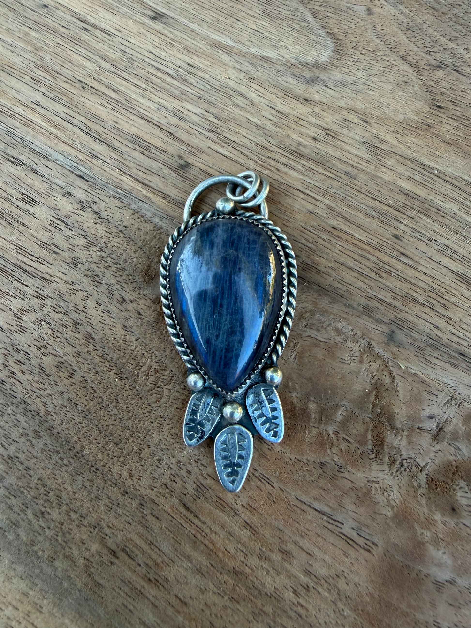 This Pendant is made with Sterling silver and a beautiful Labradorite stone. The stone has an iridescent blue flash. It has a rope boarder with three feathers. Chain NOT included. The back plate is made from 18 gauge sterling silver. Handmade by Jennifer Stone.